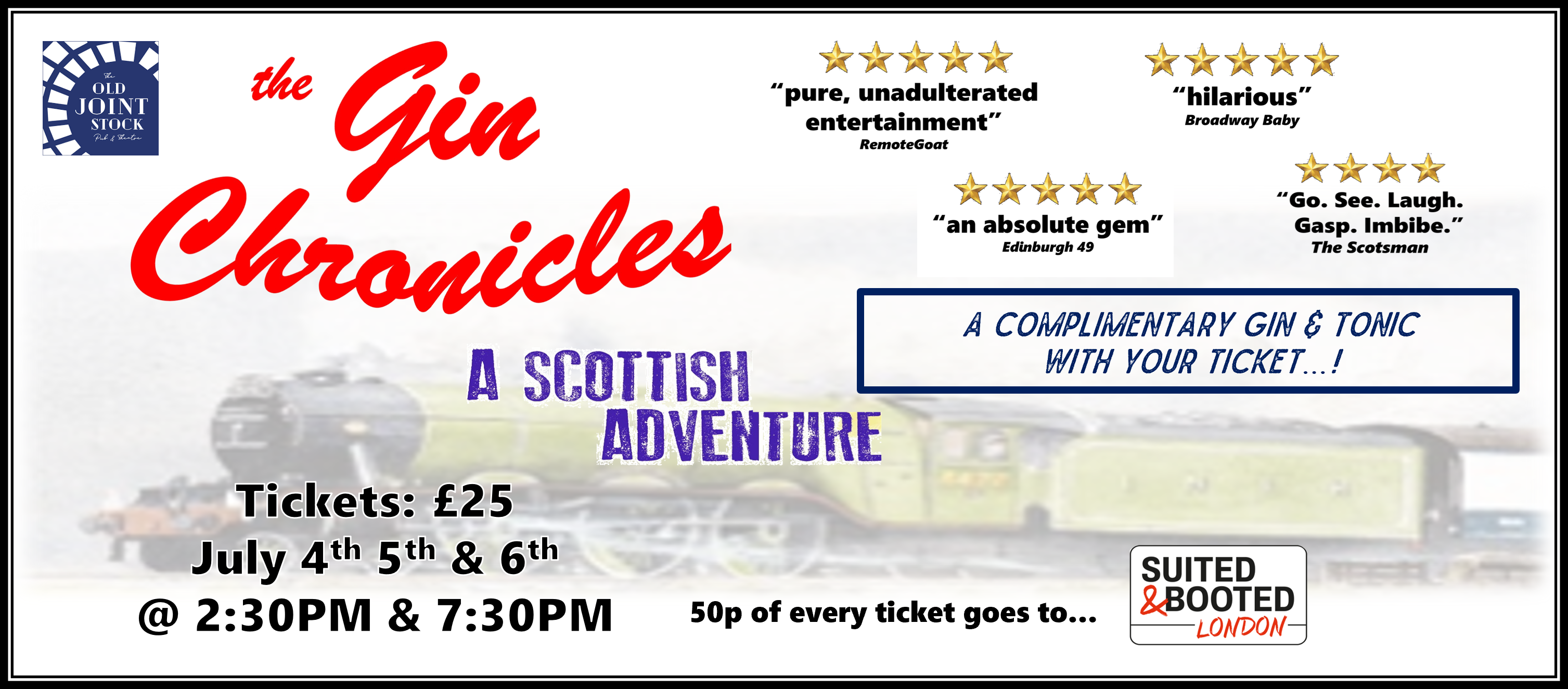 If you enjoyed The Goon Show, Monty Python or the works of P.G.Wodehouse, it is entirely rational that you would enjoy “The Gin Chronicles: A Scottish Adventure”. Vintage, radio-style comedy adventures that pick you up and take you into a world of mischief, mayhem, live sound effects and 1940s derring-do that'll have you leaving with a great big smile on your face.John Jobling is an endearing upper-class half-wit who stumbles across amateur detection as a pastime. Doris Golightly is his erstwhile housemaid who ends up being his assistant in order to stop him from wandering into ridiculous situations, with mixed results.
